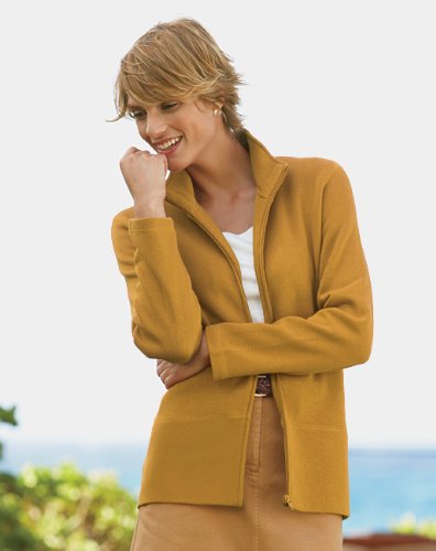 Plush garment-washed French rib cotton is as cozy as can be in our zip front sweatshirt for women. This casual zip-front sweatshirt has a stand collar, side-seam pockets, and twill-tape trim. Zip front sweatshirt for women in navy blue, bronze, paprika. Pure cotton. Washable. Imported. Sizes: S(6-8), M(10-12), L(14-16), XL(18-20); about 26" long.